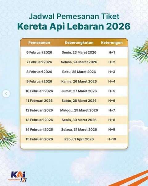 Dikutip dari akun @kai121_ di Instagram, jadwal pemesanan tiket kereta api lebaran telah dibuka mulai 25 Januari 2026.